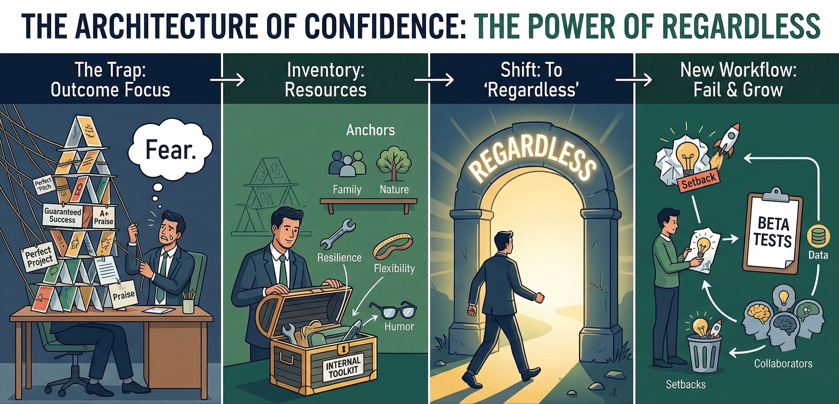 Shifting from outcome confidence to self confidence introduces a powerful workflow concept: success regardless of this outcome. Ending the “Waiting Mode”: The fear of failing can be paralyzing. Many high achievers fall into “waiting mode,” putting off the work until we feel completely “ready” so that “success” feels guaranteed. That fear fades completely when you trust that you will be successful regardless of the outcome. When you stop viewing failure as fatal, it loses its power over you. The focus shifts from protecting your ego to simply doing the work. The Freedom to Fail: When you operate from a place of self confidence, failure stops being an indictment of your character or your capacity. It just becomes one part of life guiding your growth using the resources you already know you have. “Setbacks” become beta test. Critics become a group of minds helping you improve the next iteration. It is just data to feed back into your own improvement.